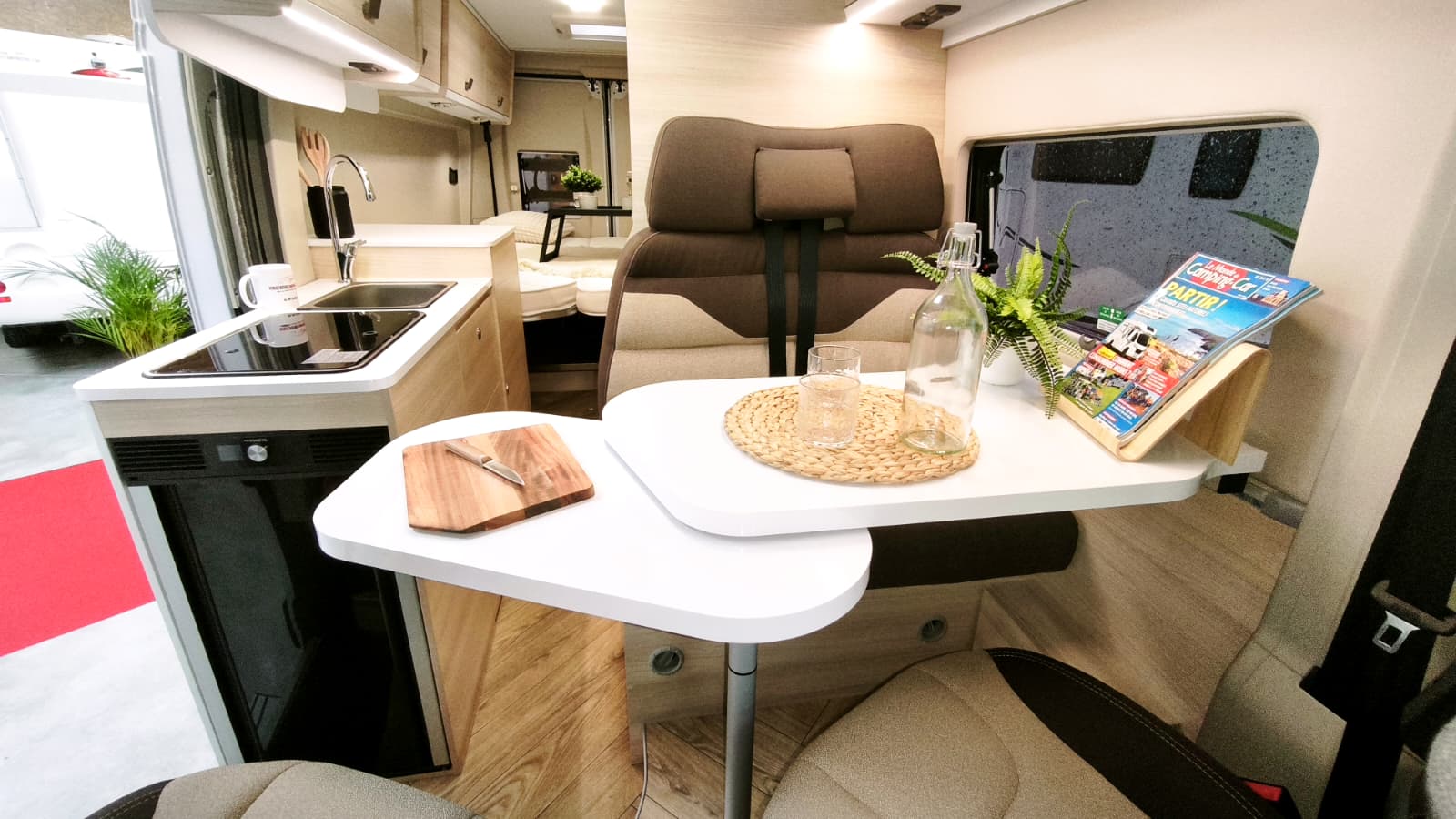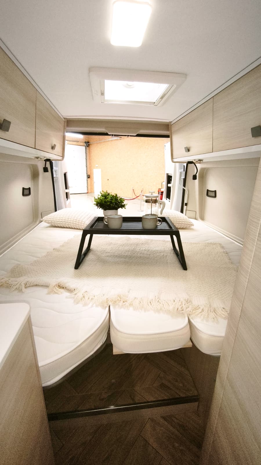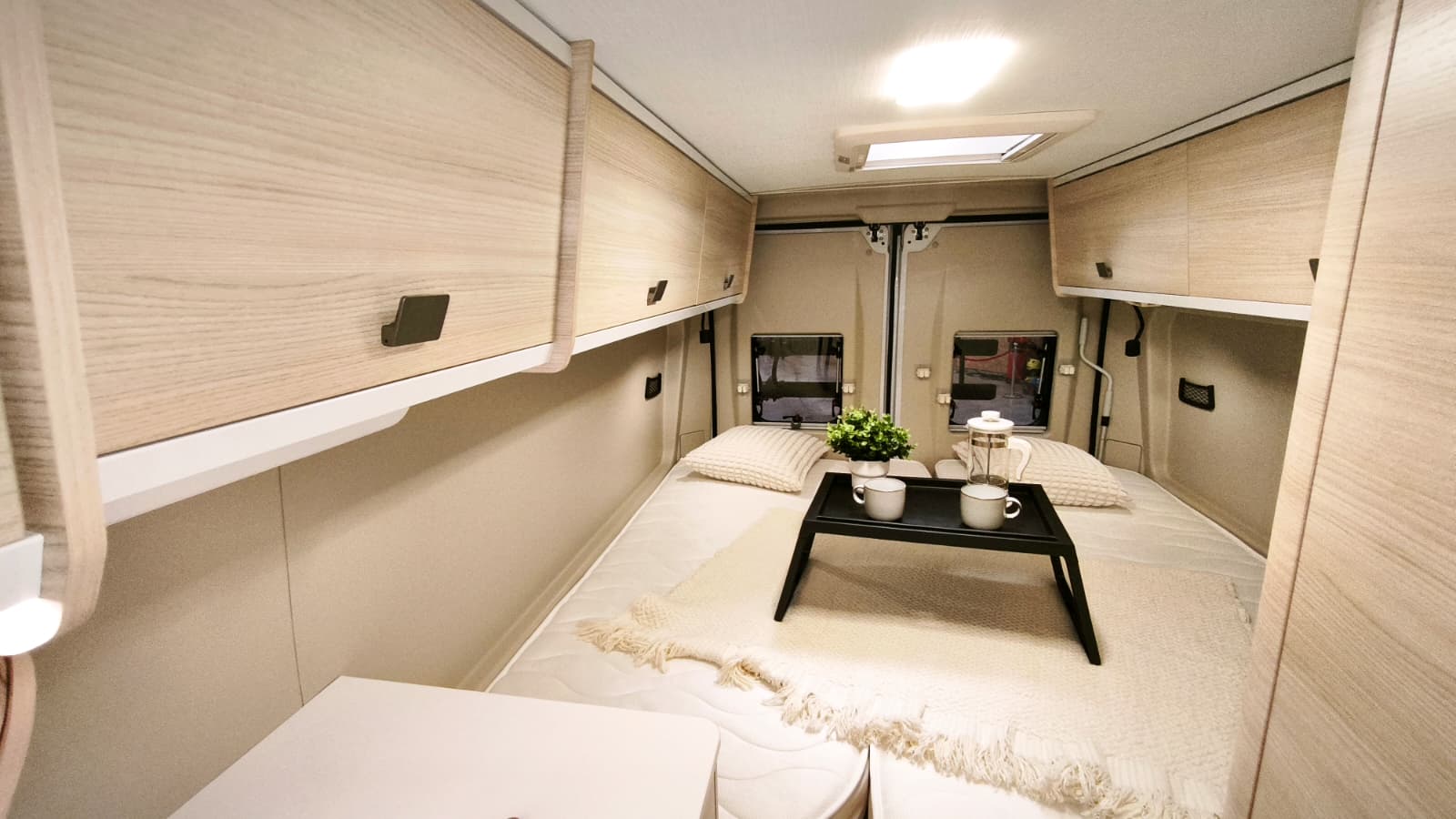 Couchages : Lit jumeaux (195 x 80 cm et 186 x 80 cm) transformable en King Size (195/186 x 186) et lit dinette 180 x 100/50