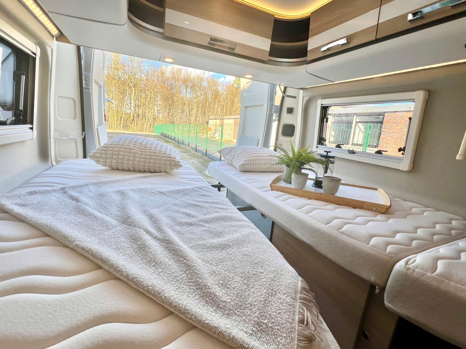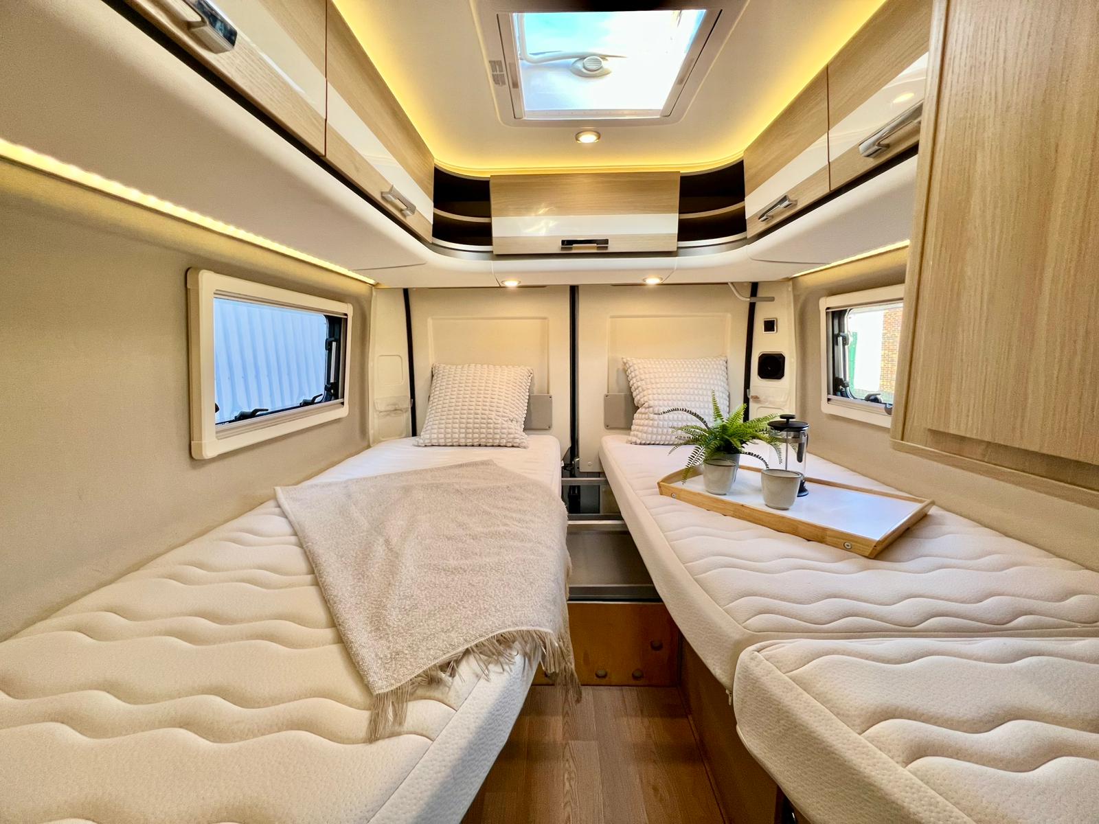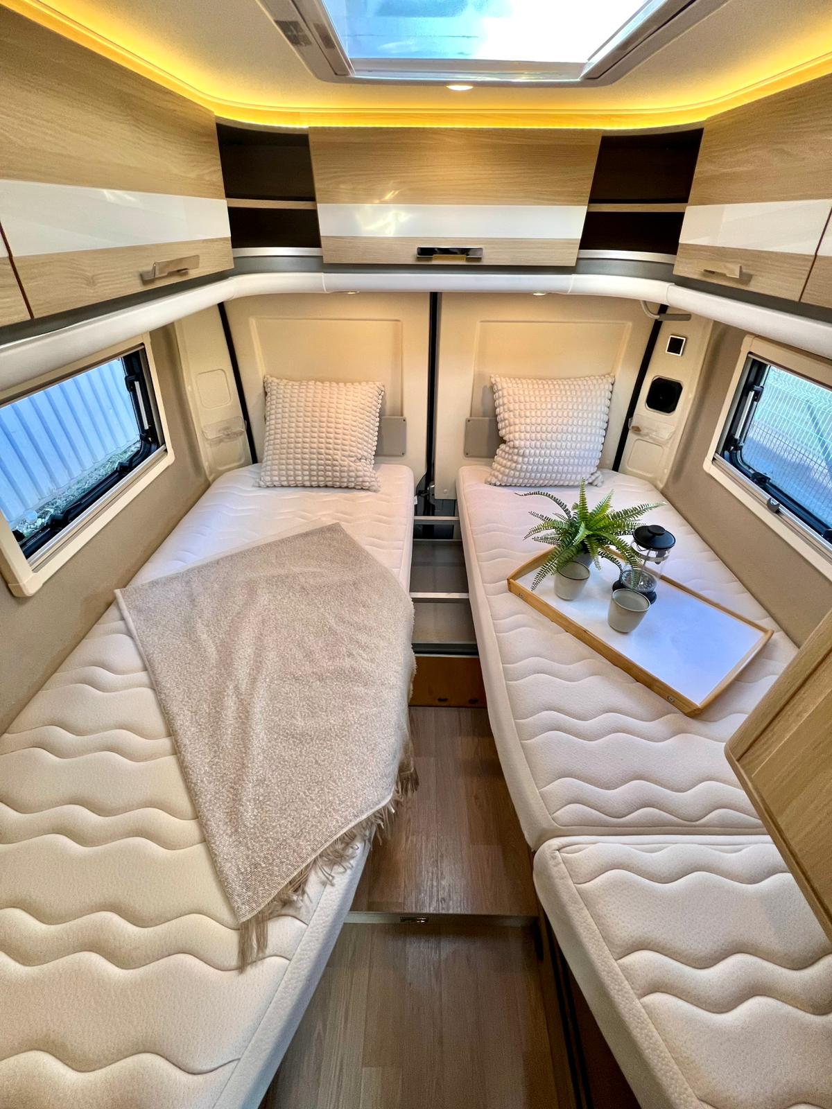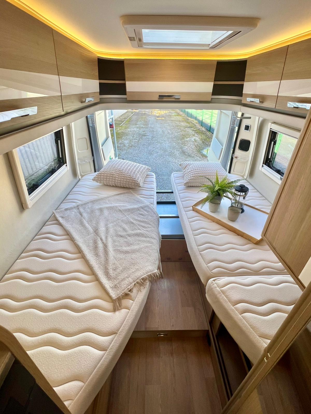 Couchages : Lit jumeaux arrière (195 x 80 cm x2 + rejoignable) & couchage dinette (185 x 97 cm)